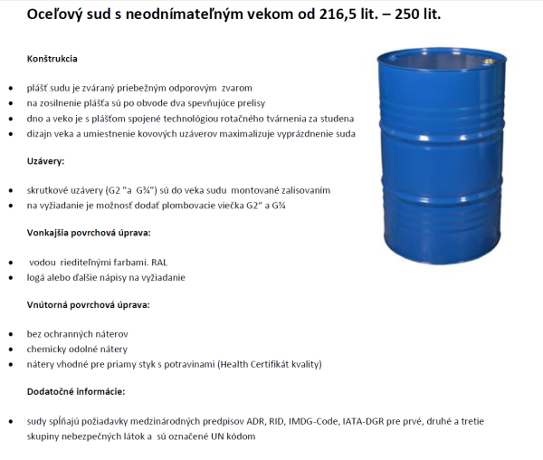 Oceľový sud s nedonímateľným vekom od 216,5 lit. do 250 lit.
